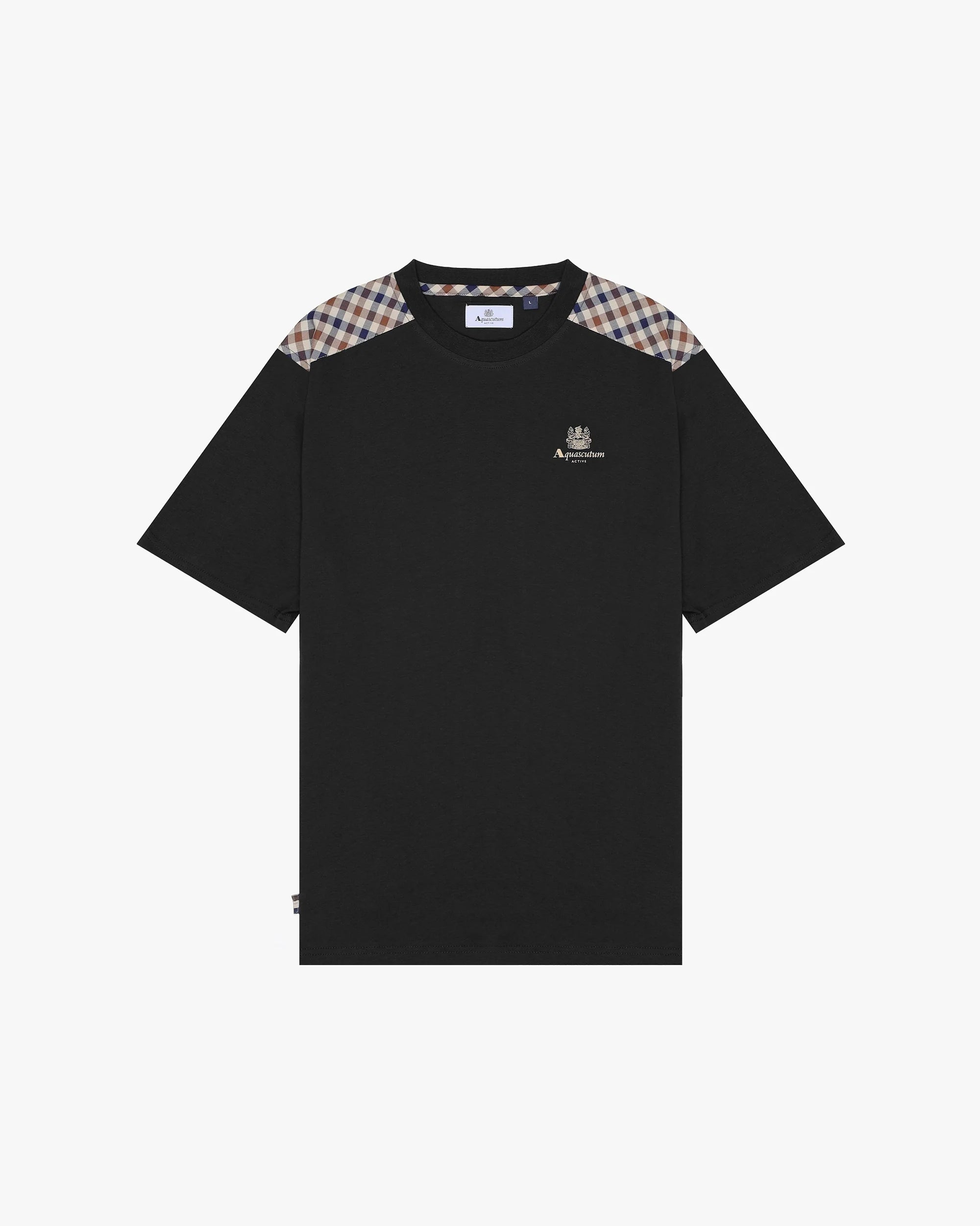 The Aquascutum Active Club Check Shoulder T-Shirt in Black blends minimalist design with the brand’s unmistakable heritage craftsmanship. Made from 100% cotton single jersey, this T-shirt offers a soft, breathable feel and a clean, structured silhouette perfect for everyday wear.
