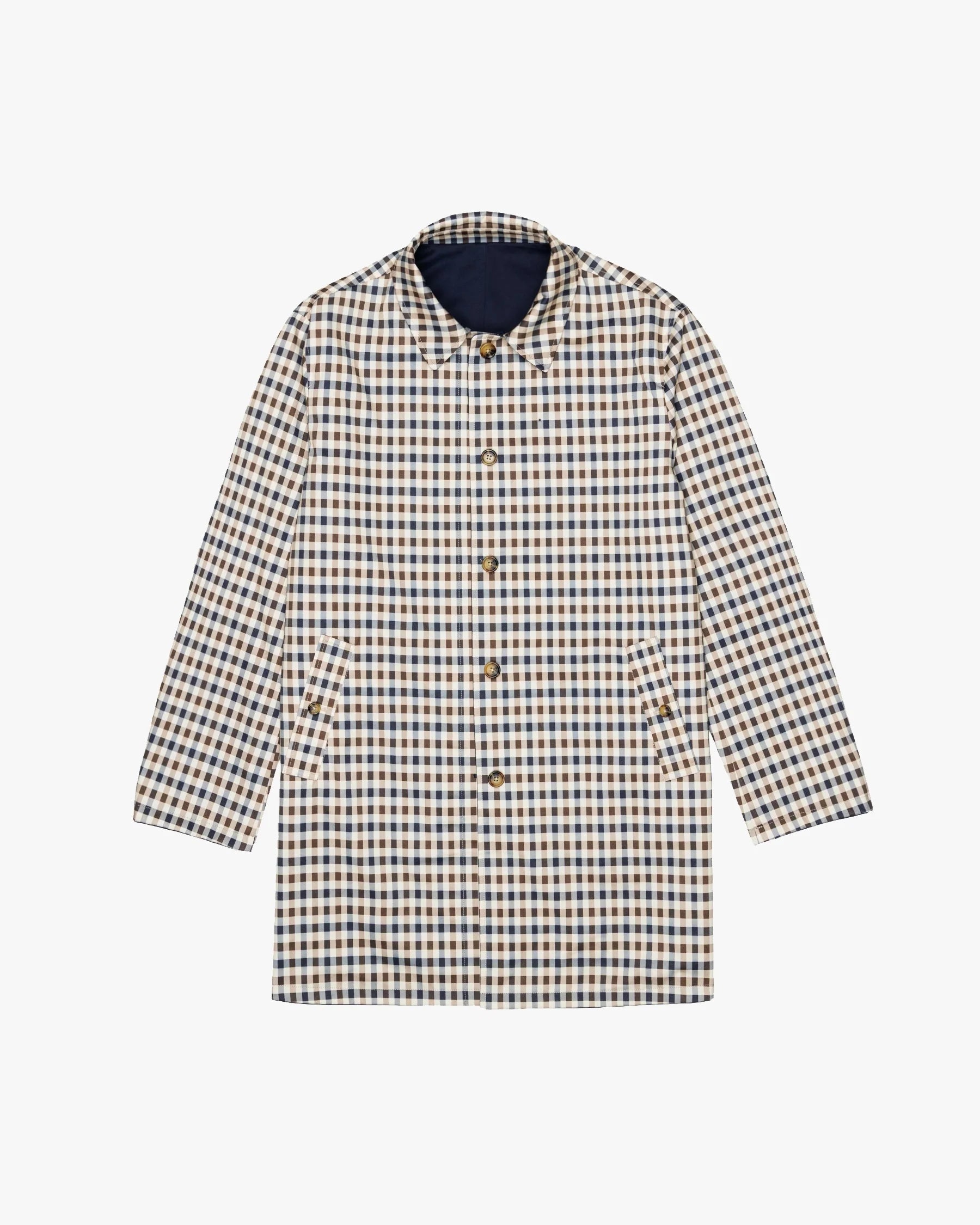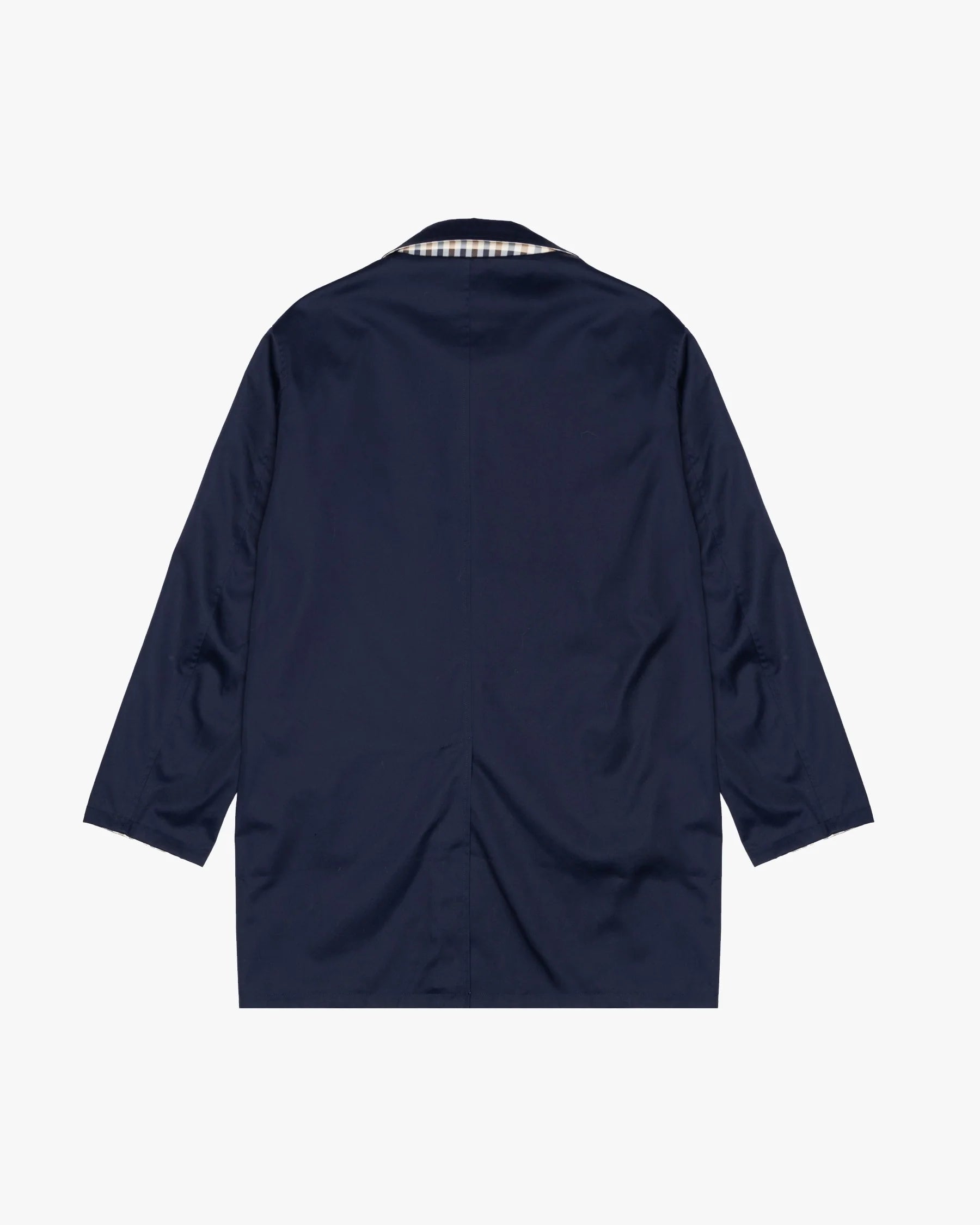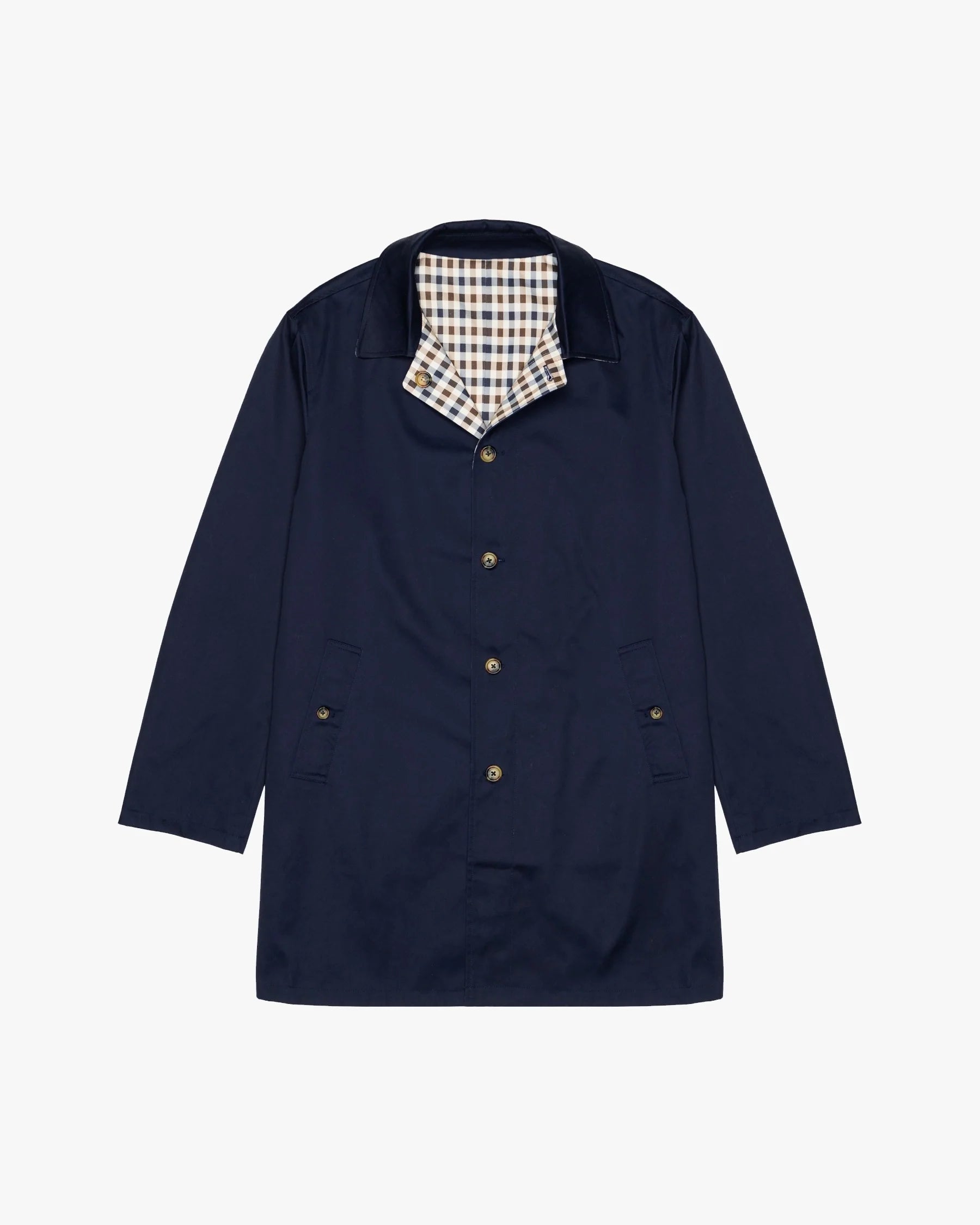The double-face reversible construction showcases two distinct styles — a sleek navy exterior for understated elegance, and the brand’s signature Club Check pattern on the reverse for a bold heritage statement. Designed with a classic collar, frontal panel with four-hole rubber buttons, and front welt pockets, the coat maintains Aquascutum’s timeless minimalist aesthetic.