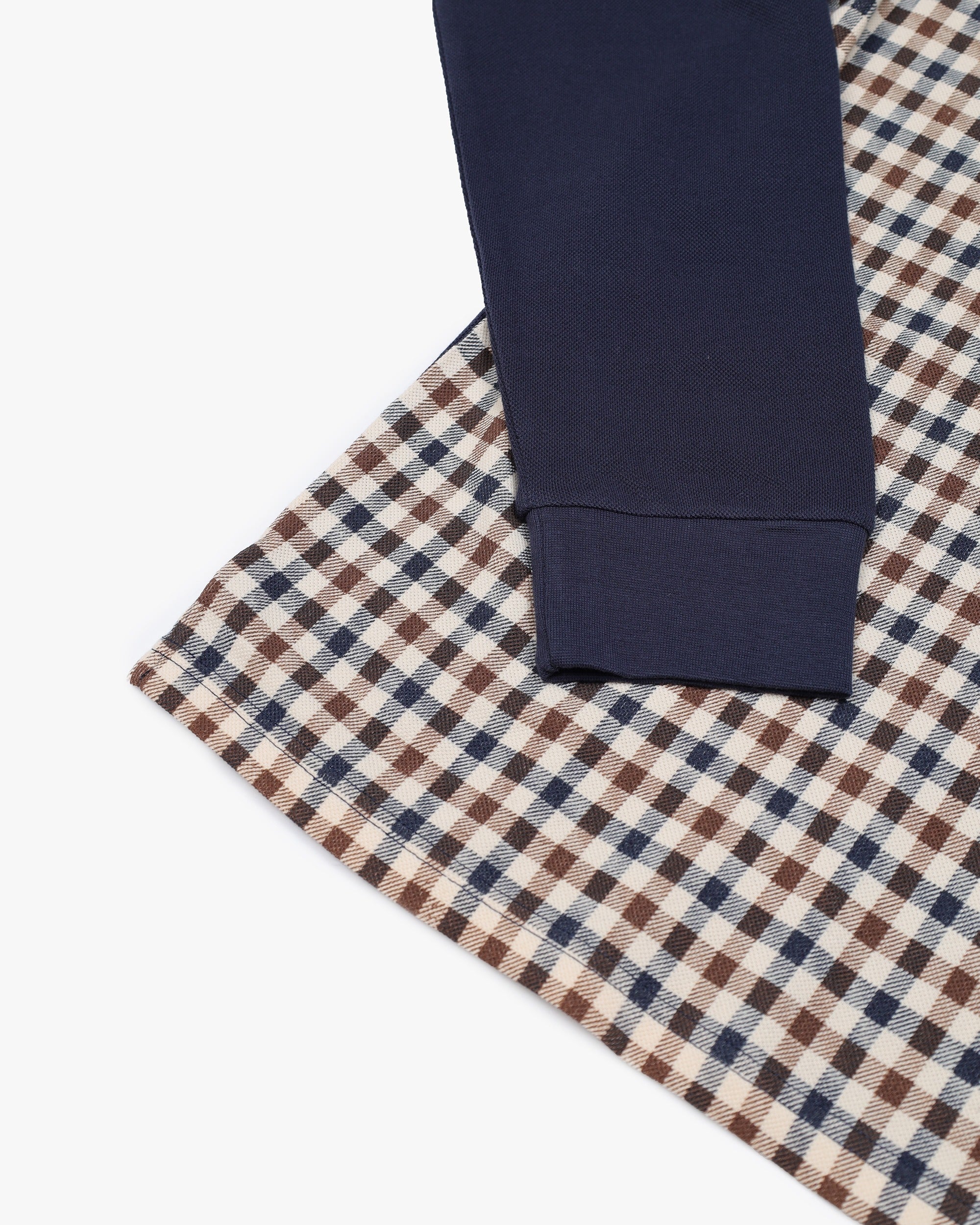 A bold Club Check panel adorns the front, contrasting elegantly with solid-colour back and sleeves. The two-button placket, ribbed collar, and ribbed cuffs provide structure and a clean finish, while the regular fit ensures comfort and versatility. Perfect for layering or wearing alone, this polo merges Aquascutum Active’s heritage with modern styling for a refined casual look.