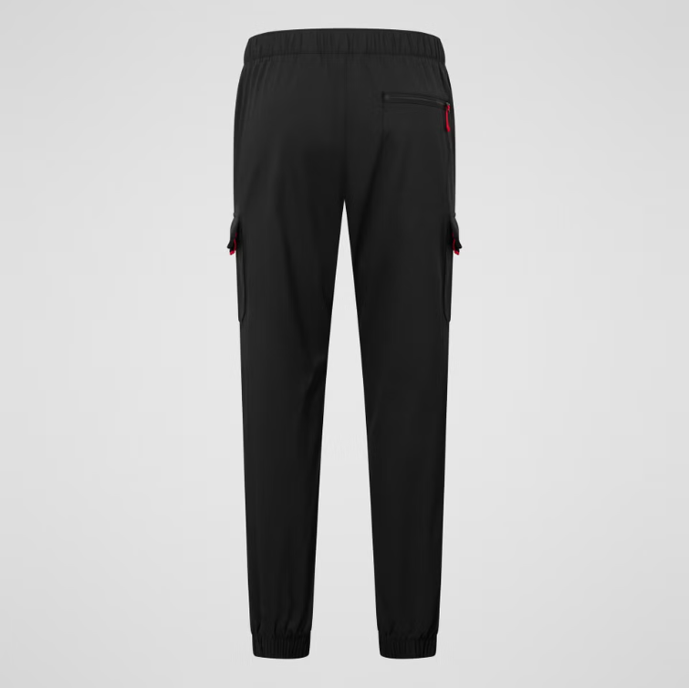 Two hand pockets, two zipped cargo pockets, and a zipped rear pocket