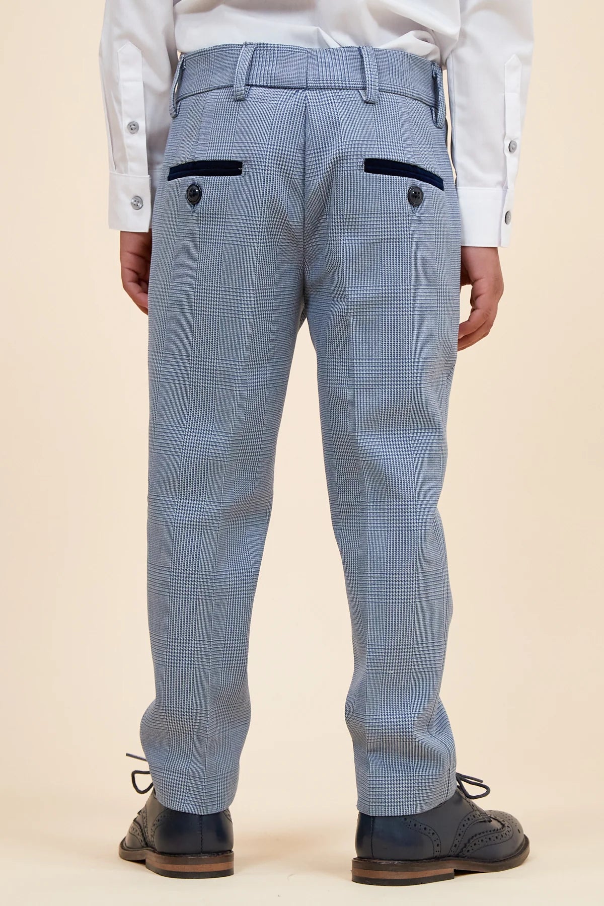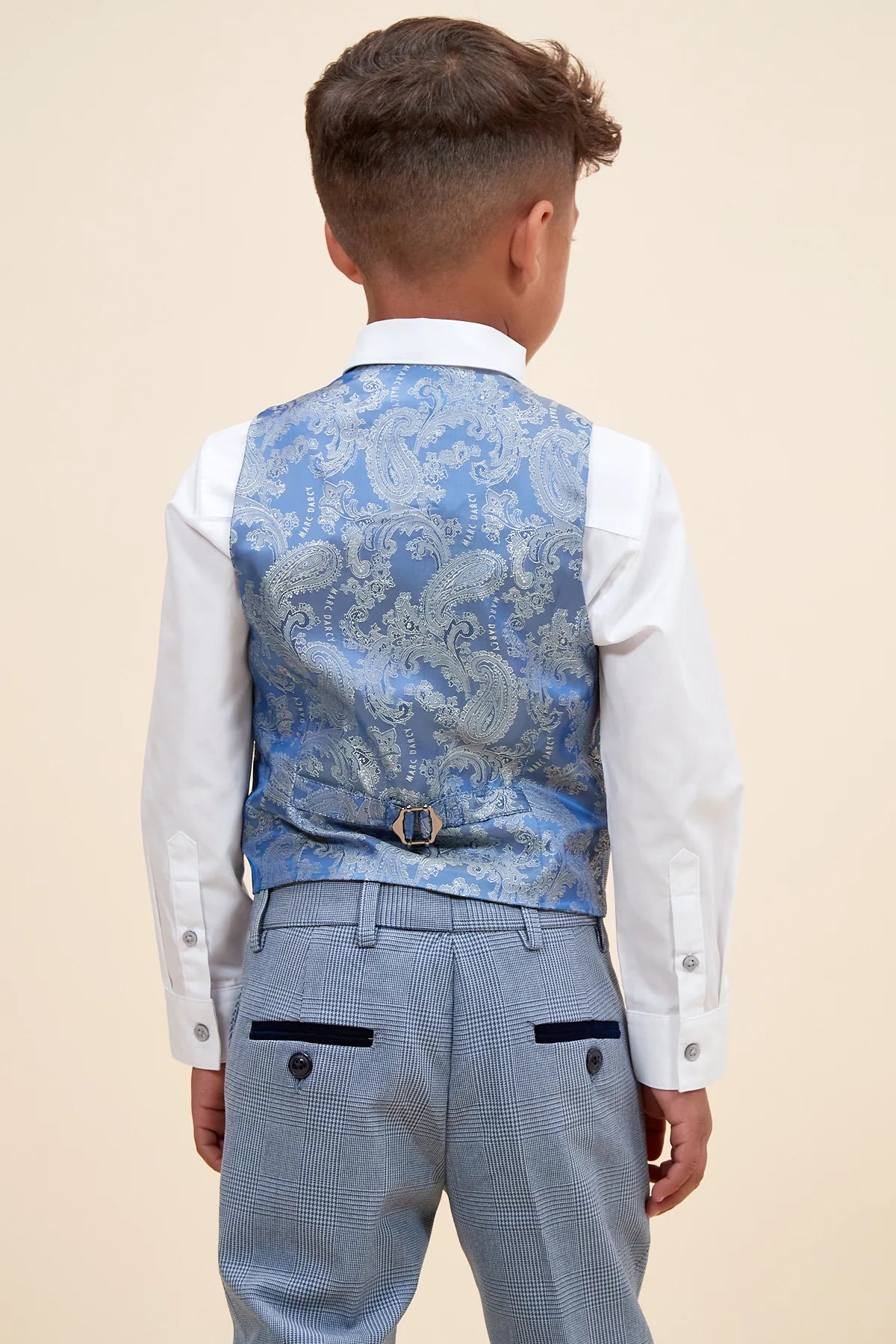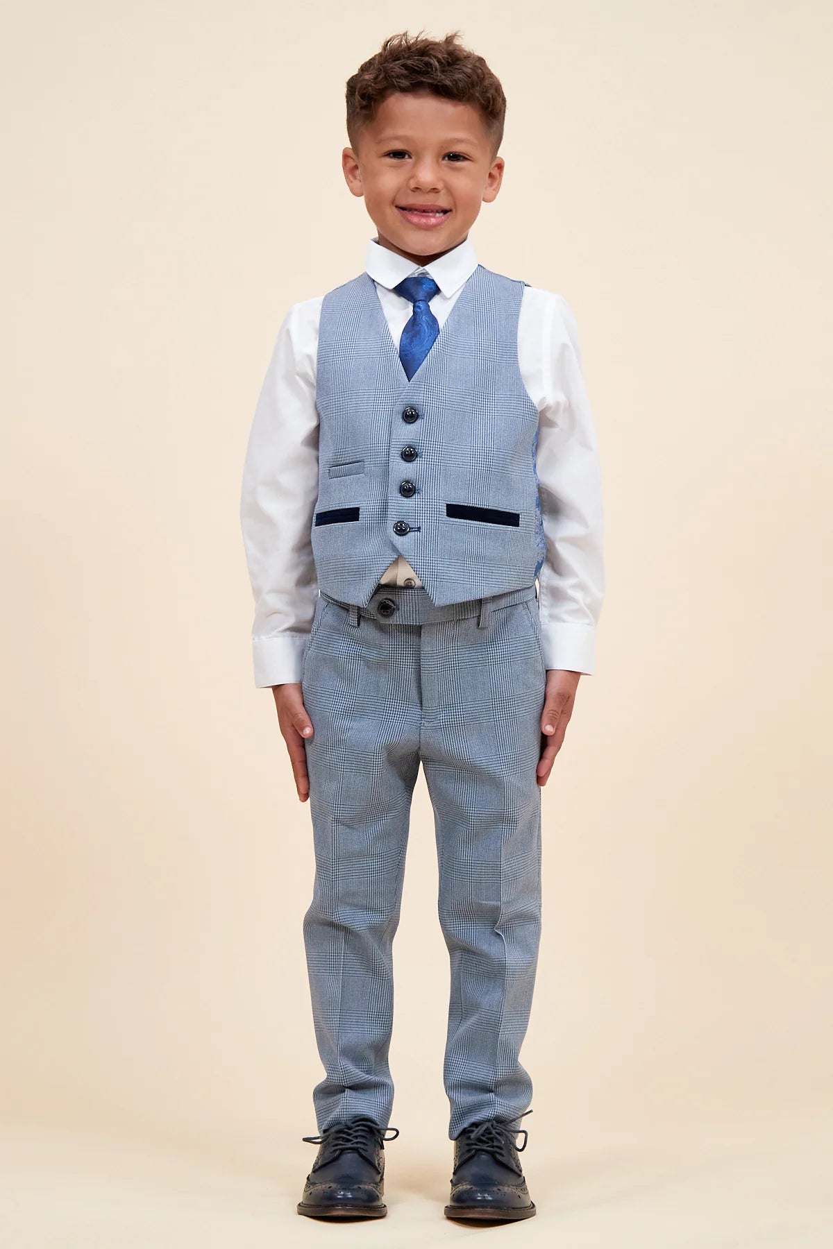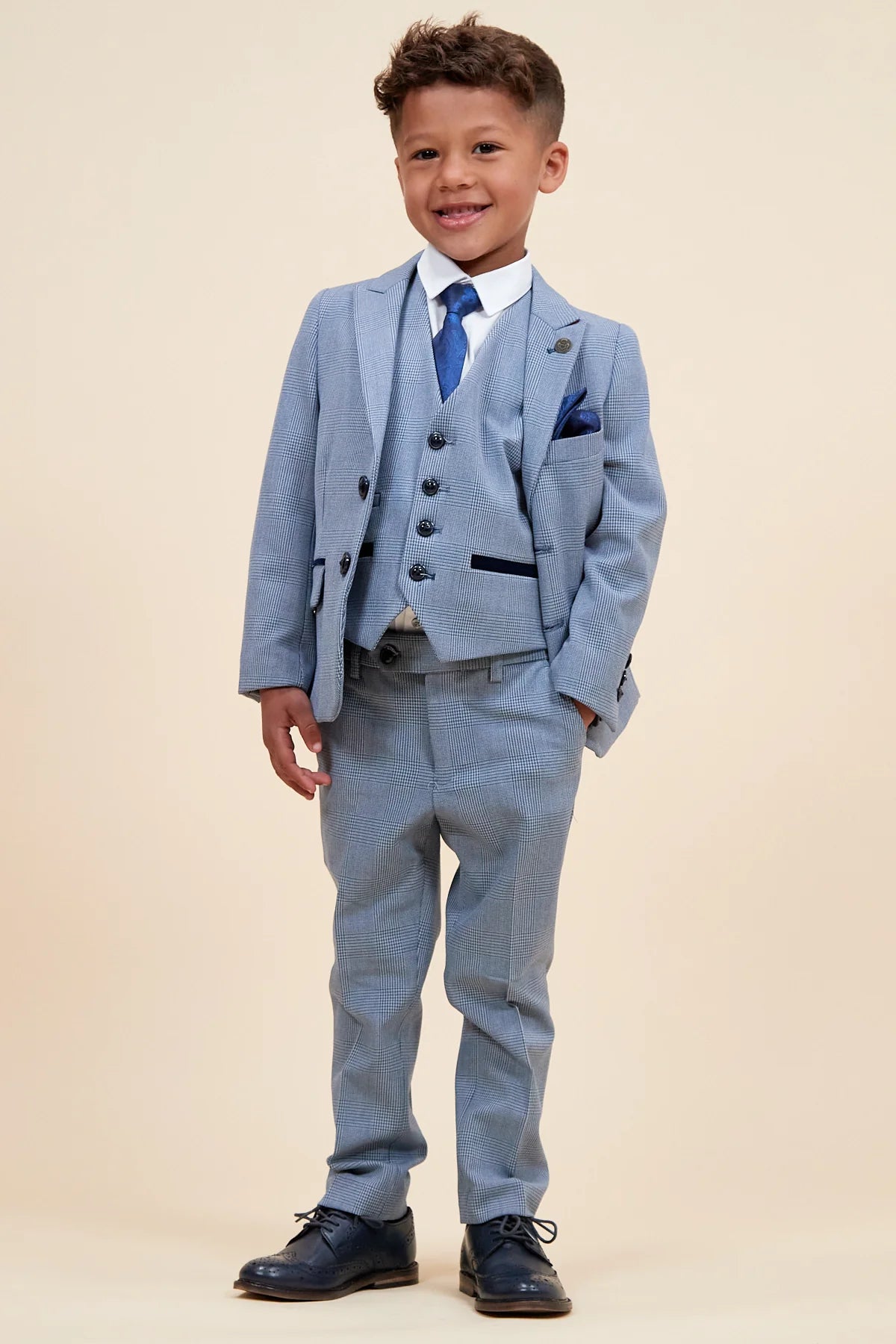 This dapper children's check suit is the perfect choice for modern day Grooms and their mini-me's. With a light blue base colour and subtle Prince of Wales check, this style comes complete with a blazer, single breasted waistcoat, and trousers.