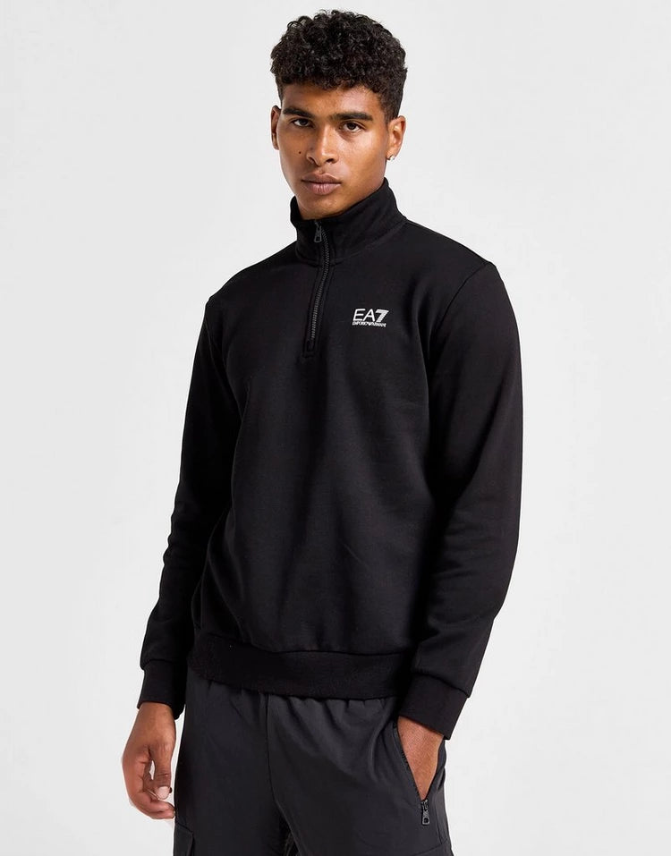 The EA7 Core Identity Quarter Zip Sweatshirt in Black delivers a refined balance of athletic comfort and modern streetwear style. Crafted from a premium cotton-blend fabric, this pullover offers a soft, breathable feel ideal for everyday wear, warm-ups, or casual layering.