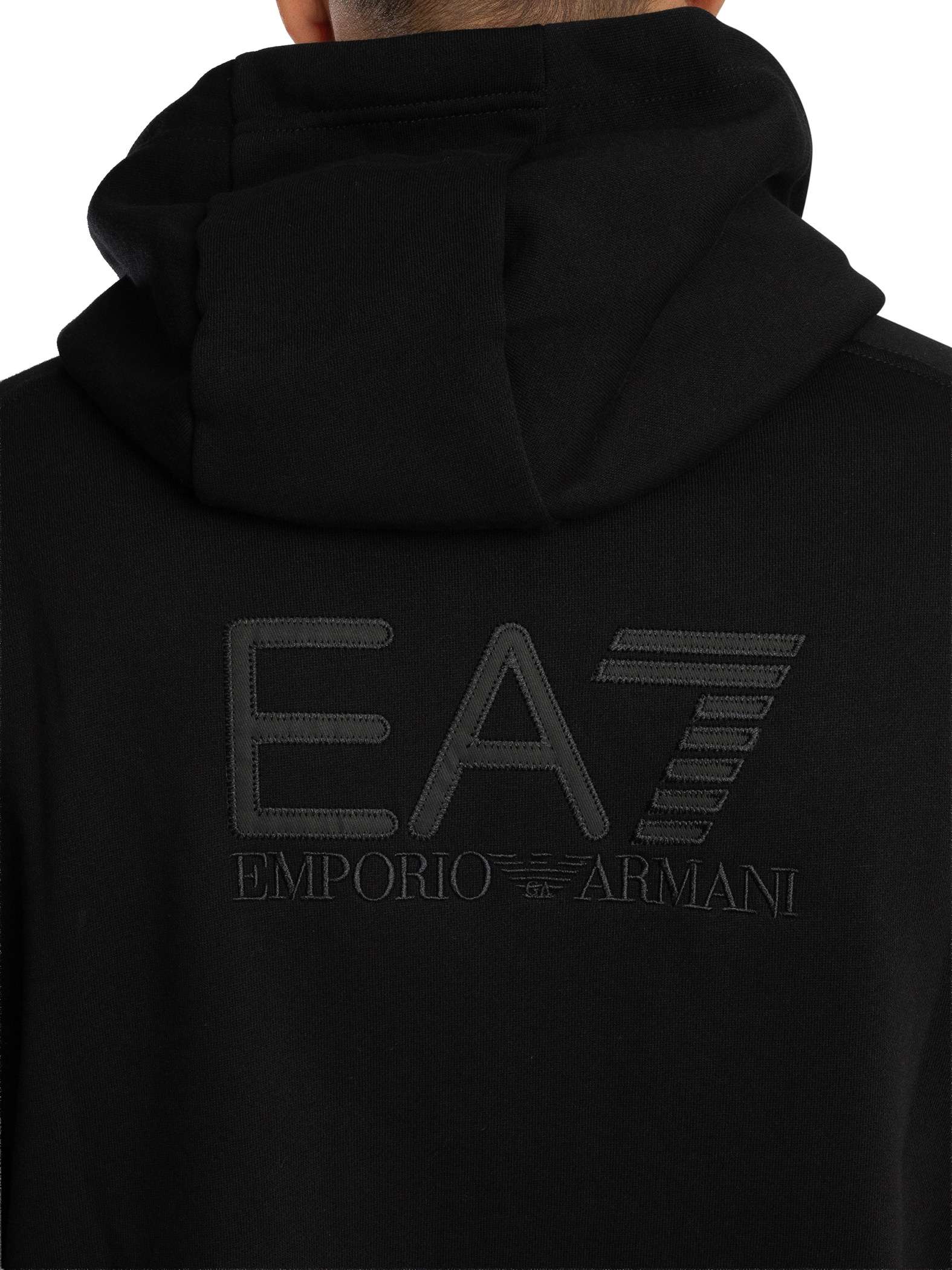The sweatshirt boasts a full zip closure, two side pockets, and a contrasting EA7 logo on the chest with a bold visibility back logo, creating a modern, sporty look. The joggers are equipped with an elasticated drawstring waist, stretch ankle cuffs, and side pockets, each adorned with the EA7 logo to complete the coordinated aesthetic.