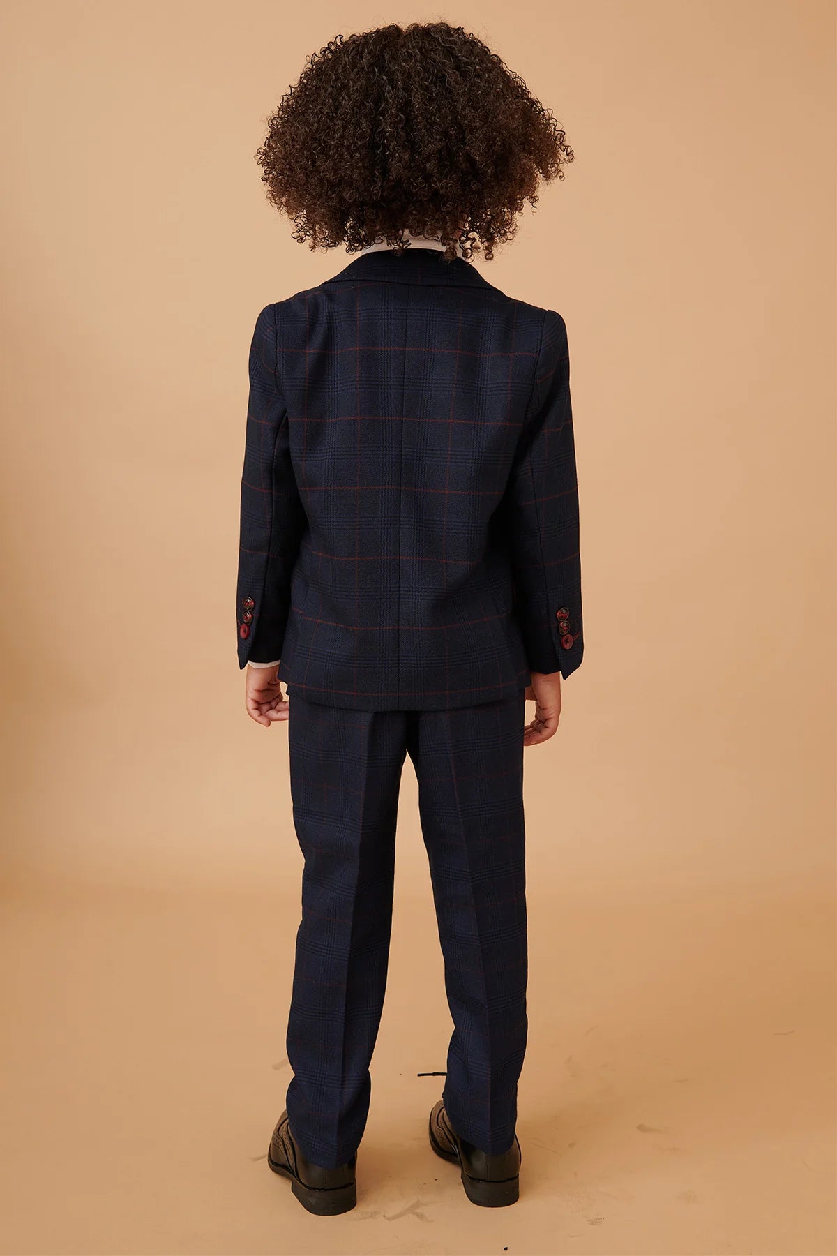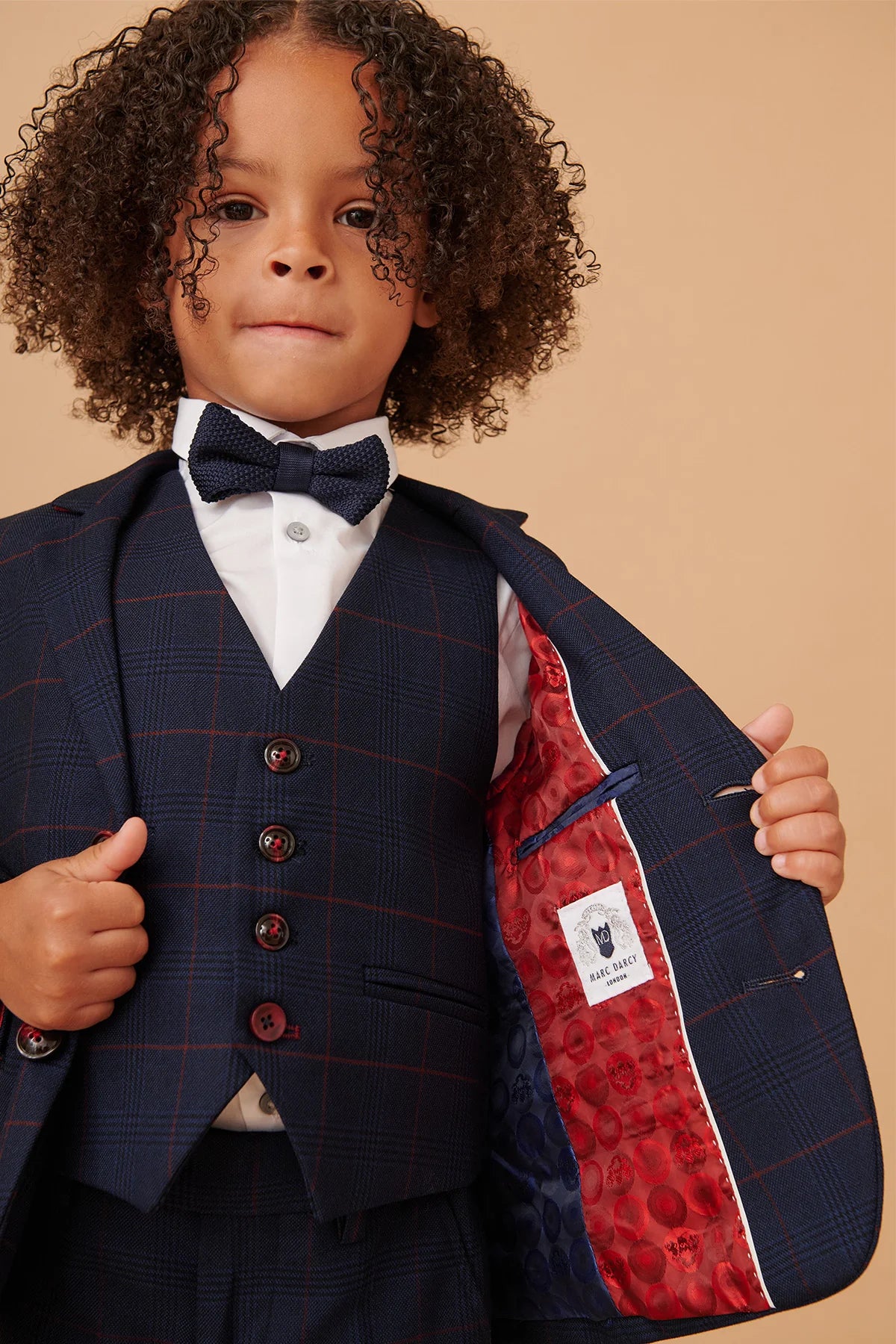 This dapper children's suit is the perfect choice for modern day grooms and their mini-me's. With a navy base colour and deep red check, this style comes complete with a blazer, single breasted waistcoat, and trousers. The waistcoat and blazer are lined with a bespoke MD printed lining, with the trouser come with handy adjuster straps on the inside making it easy to alter to fit perfectly.