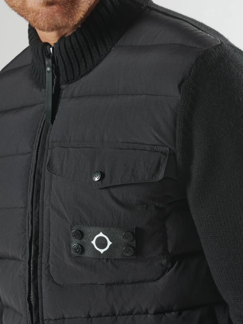 The MA.Strum Storm Knitted Jacket in Jet Black blends technical function with refined craftsmanship, offering the perfect balance between warmth, versatility, and contemporary design. Constructed with a merino wool blend for the back and sleeves, and a nylon-insulated front panel, this piece provides lightweight insulation with a sleek, modern finish.