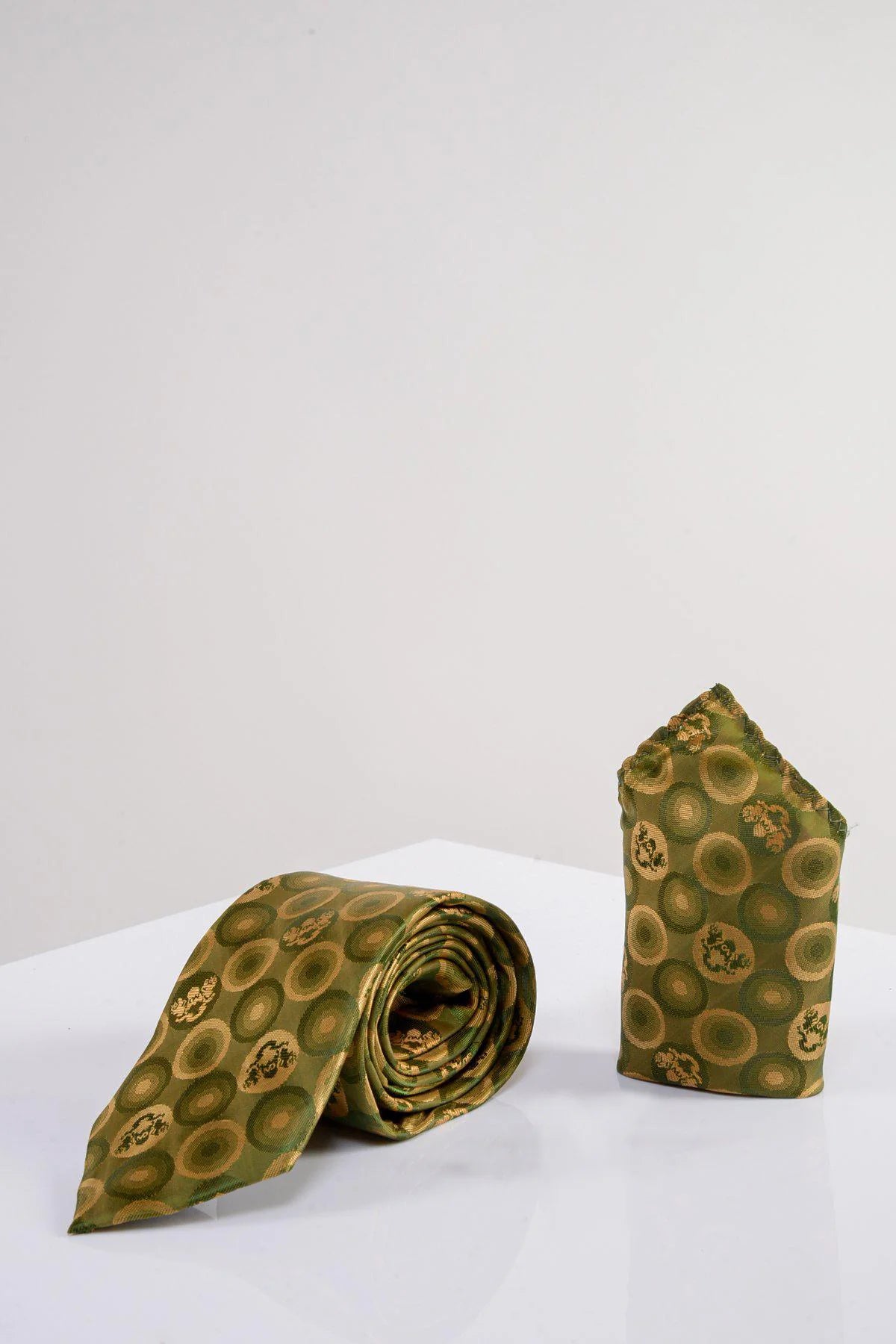 Featuring a distinctive MD logo print, this gold tan accessory set will add a dash of uniqueness to your formalwear outfits. Wear the tie and pocket square together for a cohesive ensemble that oozes style.