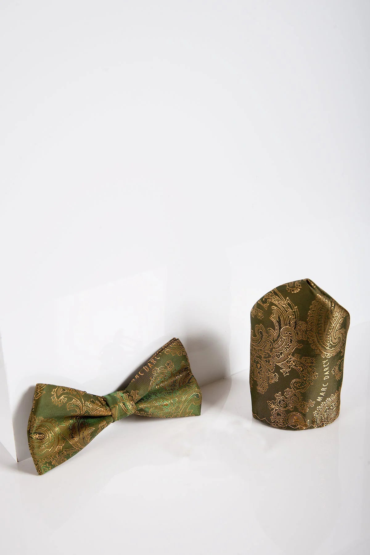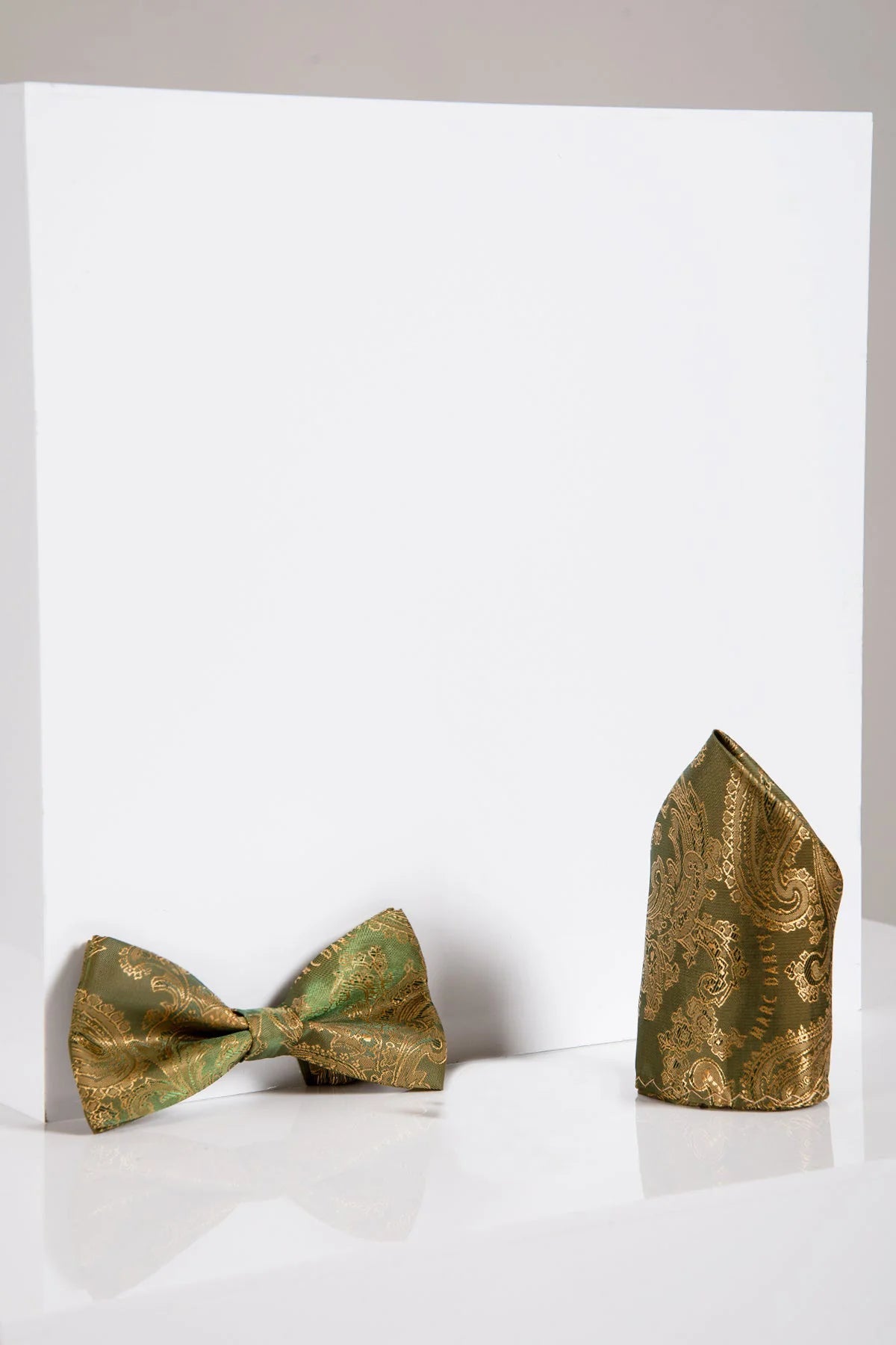 Add a shine to your look with this tan/gold bow tie set. Featuring a contemporary paisley design, which is also featured on many of our suit linings, this set is the perfect finishing touch to your evening ensemble.