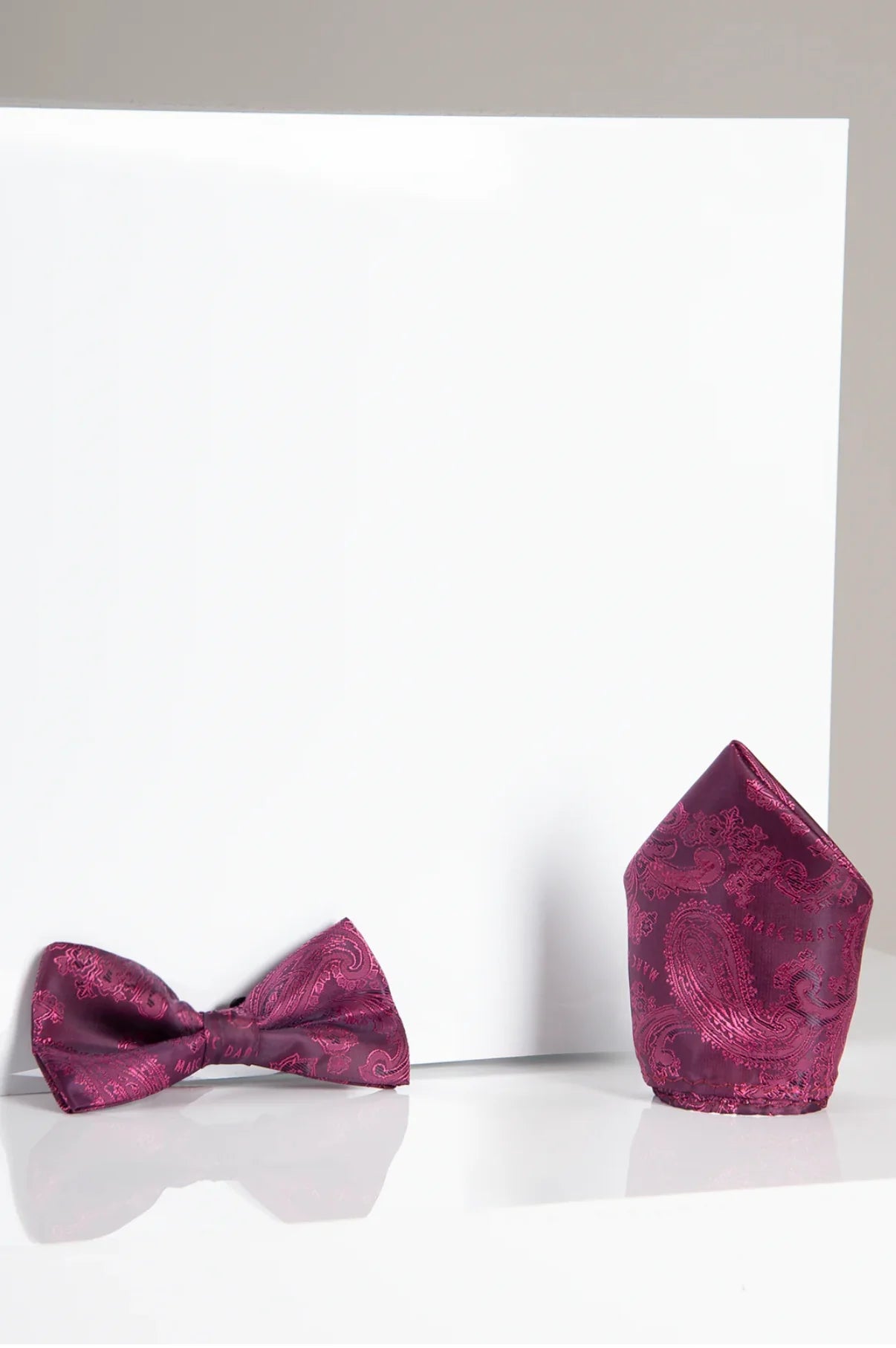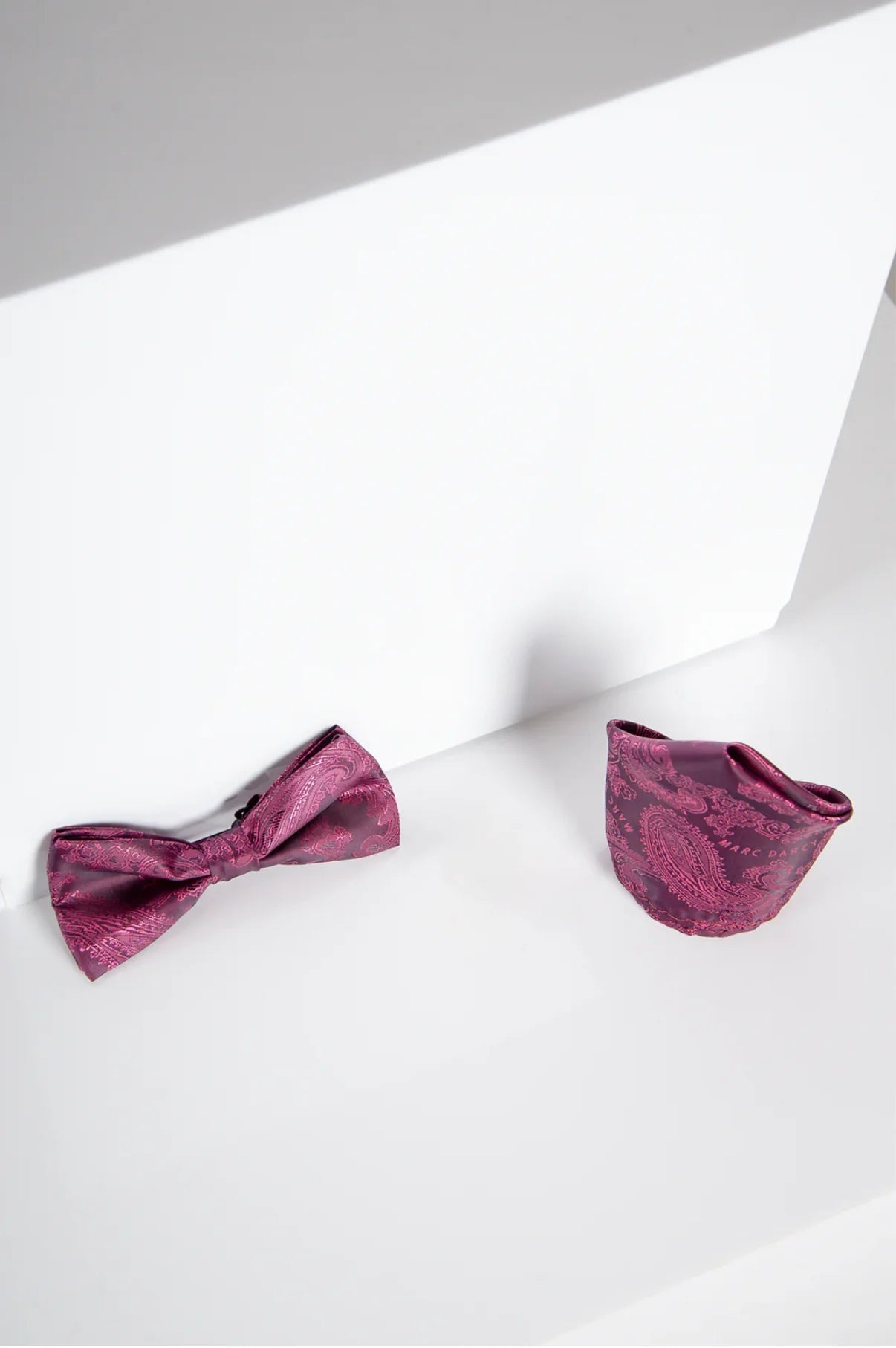 Add a shine to your look with this berry bow tie set. Featuring a contemporary paisley design, which is also featured on many of our suit linings, this set is the perfect finishing touch to your evening ensemble.