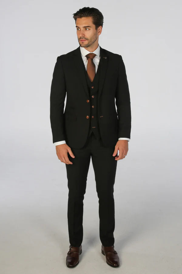 Upgrade your style with the Mayfair Black Men's 3-piece suit, expertly combining timeless elegance with a modern twist. The classic black fabric is enhanced by distinctive brown buttons and a rich brown lining, adding a touch of warmth and sophistication. Perfect for weddings, corporate events, or any special occasion, the Mayfair suit is designed to make a lasting impression. Choose your size and let Mayfair refine your look with effortless grace.