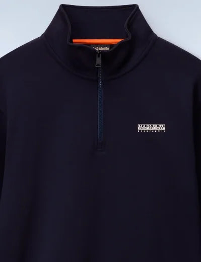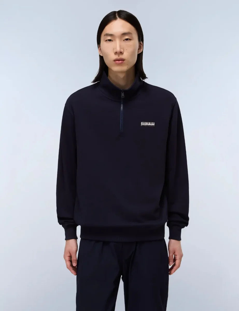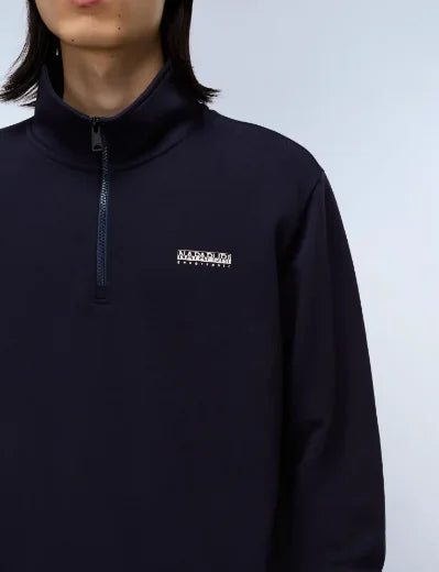 The Napapijri Small Box Half Zip Sweatshirt in Blu Marine offers a sleek and contemporary take on casual layering. Made from 100% premium cotton, it features a funnel neck with half-zip closure for adjustable coverage and easy styling during cooler days.