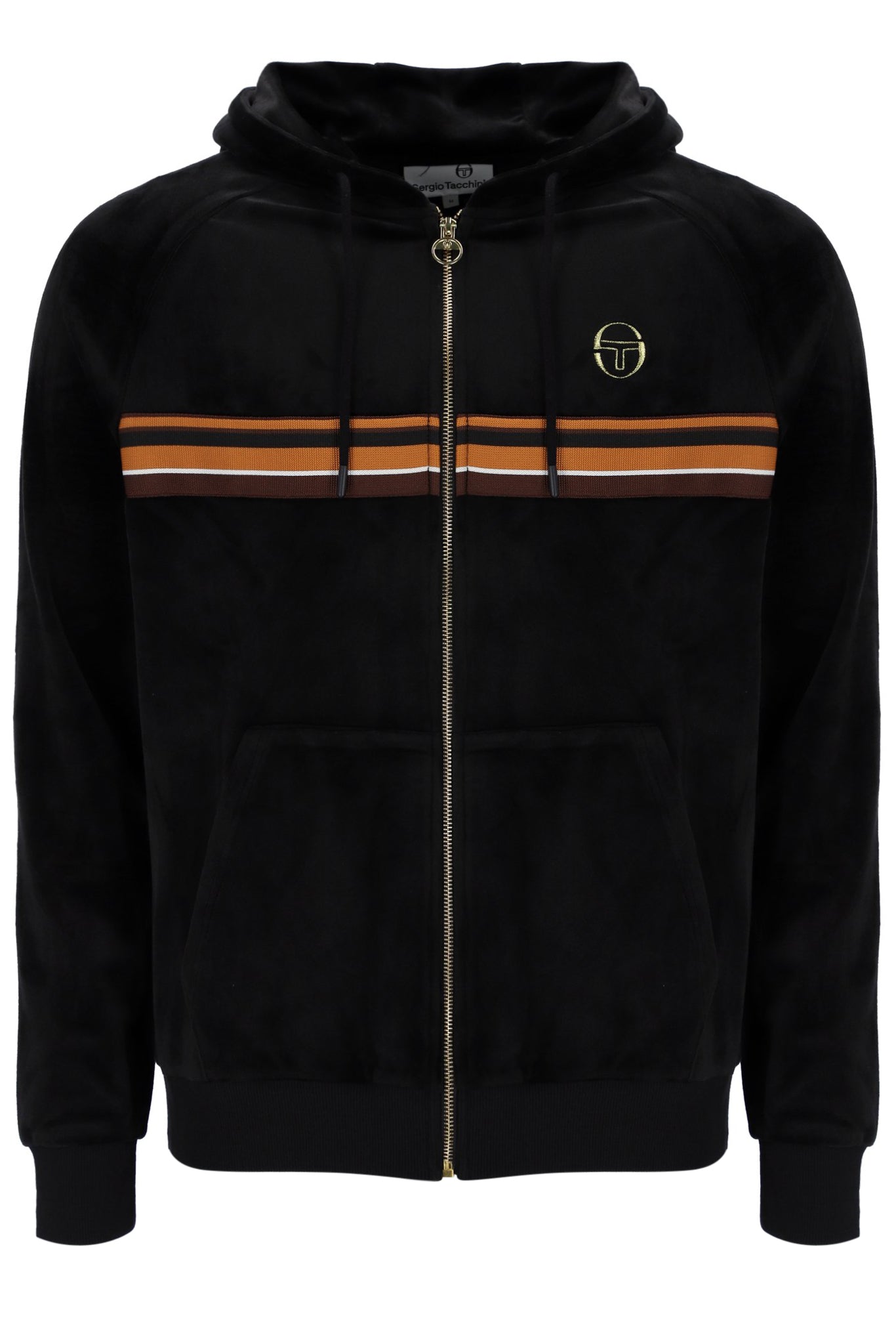 Designed with practical sportswear detailing, it features a branded full-length zip closure, drawstring hood for adjustable coverage, and open side pockets for convenience. The embroidered Sergio Tacchini logo on the chest and subtle gold accent detailing elevate its sophisticated aesthetic.