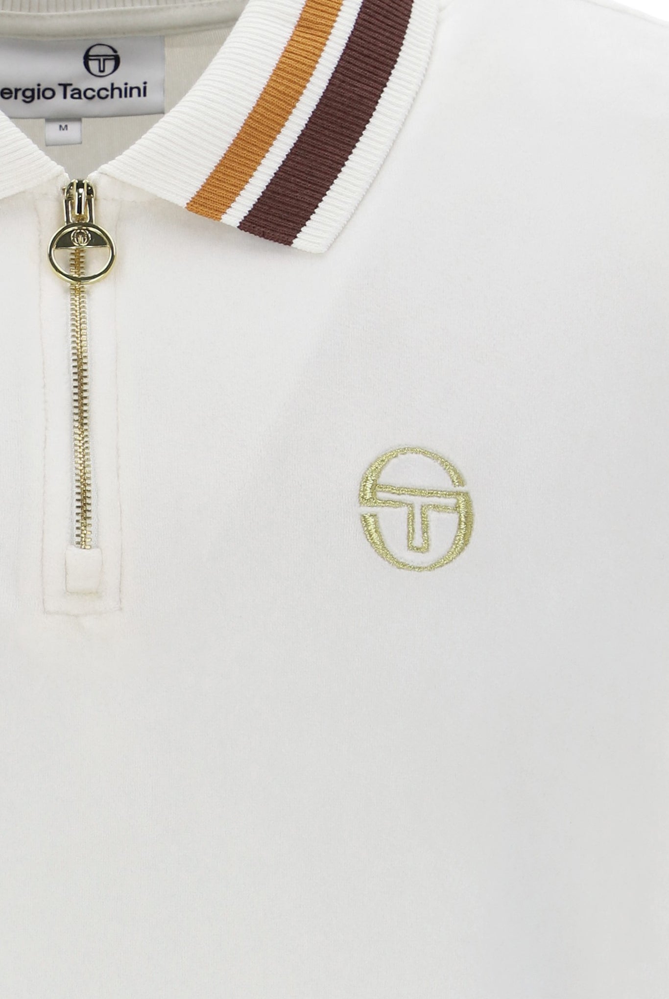 Retro luxury meets modern refinement in the Sergio Tacchini Mahony Velour 1/4 Zip Polo in Gardenia. Crafted from premium velour fabric, this polo combines exceptional softness, durability, and a distinct sense of sophistication — a perfect statement piece for those who appreciate elevated sportswear style.